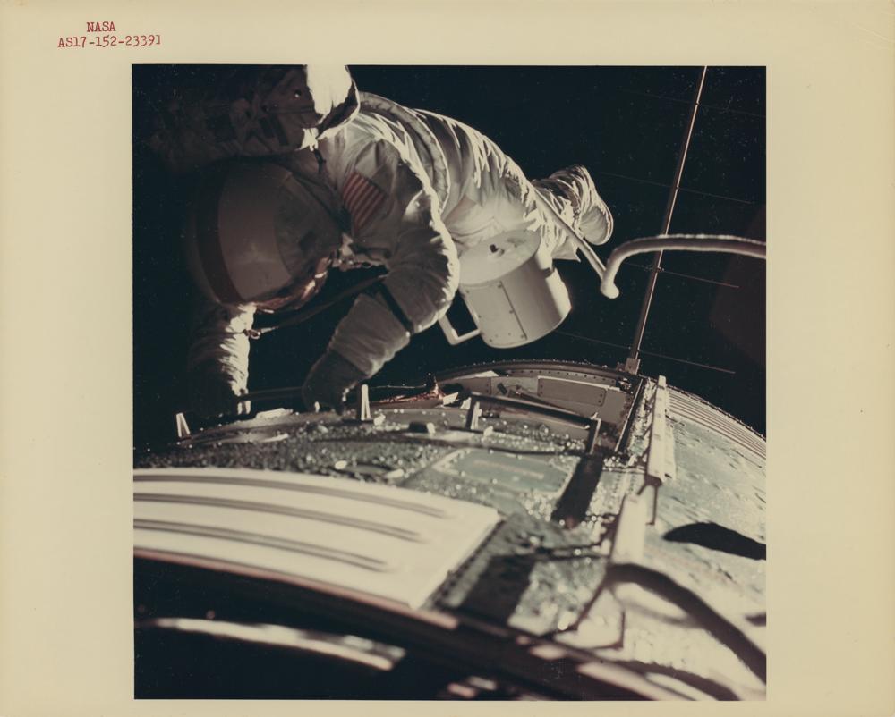 Original vintage color glossy 10 x 8 red-numbered NASA photo (AS17-152-2339]) of Apollo 17 CMP Ron Evans performing extravehicular activity during the Apollo 17 spacecraft's trans-Earth coast. During his EVA, Evans retrieved film cassettes from the Lunar Sounder, Mapping Camera, and Panoramic Camera. The total time for the trans-Earth EVA was one hour, seven minutes, 18 seconds, on Sunday, Dec. 17, 1972. Reverse of photo bears "A Kodak Paper" watermarks. In fine condition, with creasing to the upper right corner tip. Accompanied by a certificate of authenticity stating that the photo derives from the personal collection of Paul Werner Gast, an American geochemist and geologist (1930-1973) who led geo-science management of the Manned Spacecraft Center in preparation for Apollo mission sample return from the Moon. He served as chief scientist of the Apollo Lunar Science Staff, and was one of the science consultant group known unofficially as the 'Four Horsemen,' along with Jim Arnold, Bob Walker and Gerry Wasserburg.