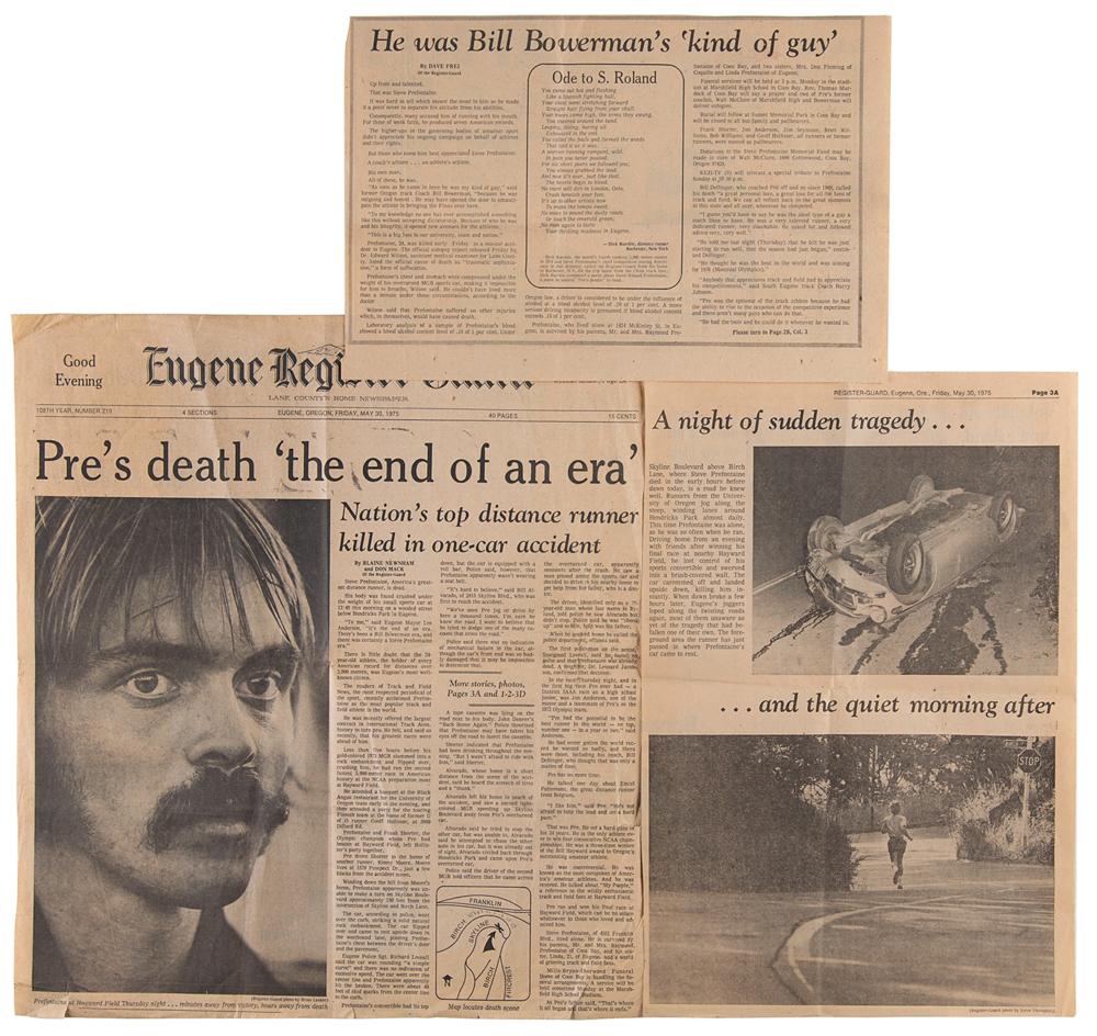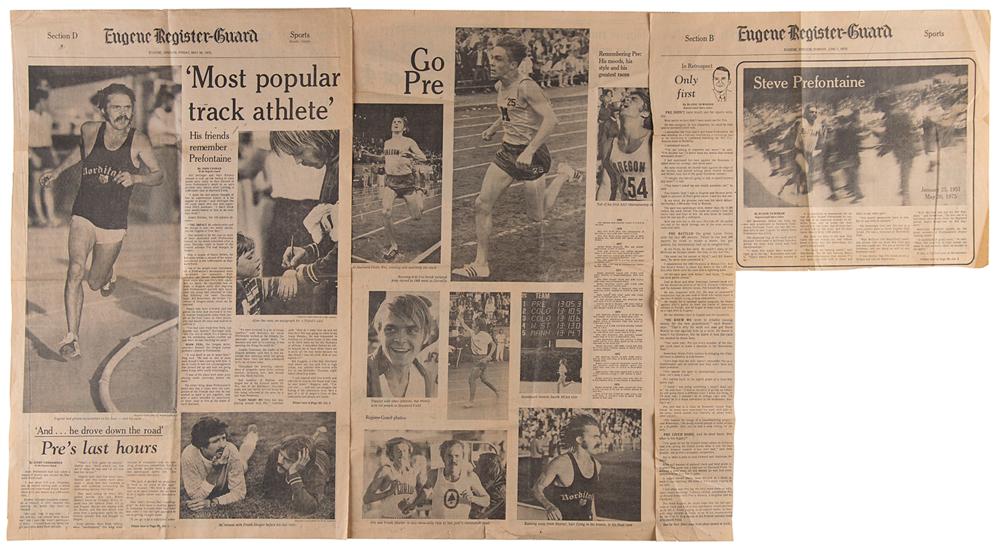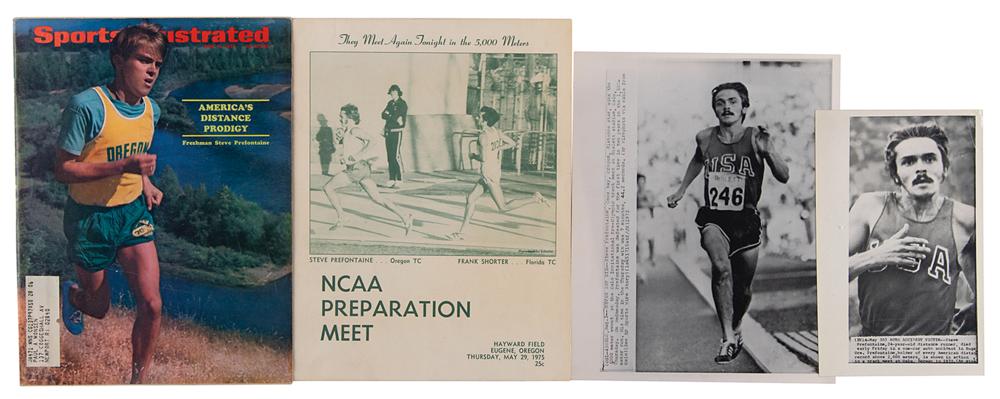 Promising American long-distance runner (1951-1975) who was killed in an auto accident at the age of 24. Collection of ephemera associated with Steve Prefontaine, including: a complete issue of Sports Illustrated from June 15, 1970, featuring a cover story on "America's Distance Prodigy," Steve Prefontaine; an original glossy 8 x 10 press photo of Prefontaine winning the 3000m event at the Oslo Invitational in 1972; an original glossy 5 x 8 photo of Prefontaine at the same Oslo meet, with caption referencing his death; an original program from the NCAA Preparation Meet at Hayward Field, Eugene, Oregon, May 29, 1975-the day before Prefontaine's accident-which hosted 5,000-meter race that Prefontaine won; six original color satin-finish 5 x 3.5 candid photos taken at the May 29th track meet; and six pages of newspaper clippings from the Eugene Register-Guard, May 30, 1975, covering his death and legacy. In overall fine condition.