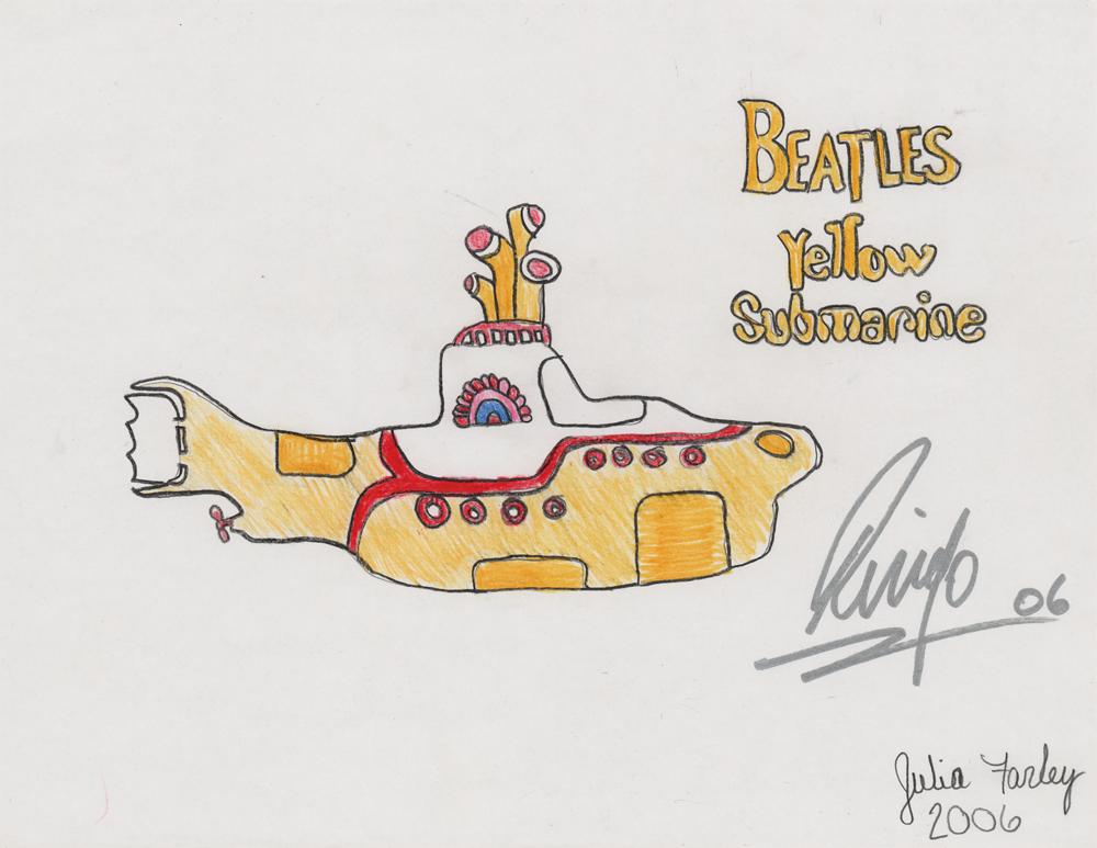Sketch of the "Yellow Submarine" from the 1968 animated Beatles film, accomplished in graphite and colored pencil on an off-white 11 x 8.5 sheet by Fab Four fan Julia Farley in 2006, signed in the lower right in silver ink by Ringo Starr, "Ringo, 06." In fine condition.