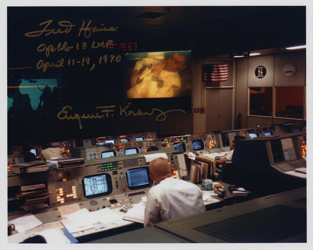 Color satin-finish 10 x 8 photo of Gene Kranz watching an image of Fred Haise on a large screen at Mission Control, signed in gold ink, "Fred Haise, Apollo 13 LMP, April 11-17, 1970" and "Eugene F. Kranz." In very fine condition.