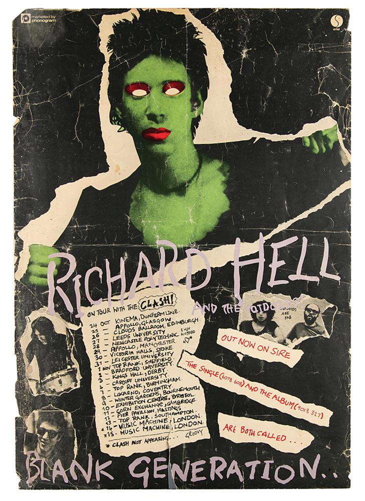 Scarce original color 19.5 x 28 Sire Records promotional poster for the release of 'Blank Generation,' the 1977 debut album from punk rock band Richard Hell and the Voidoids, which features a large image of a green-faced, red-lipped, and empty-eyed Hell above his band name, the album name, images of the band members, and a list of October and November concert dates that reads, "On tour with the Clash." Asterisks indicate that the Clash won't appear on the last two dates at London's Music Machine (November 14 and 15, 1977). In very good condition, with heavy overall creasing, minor edge loss, and several tears repaired with old tape on the reverse.