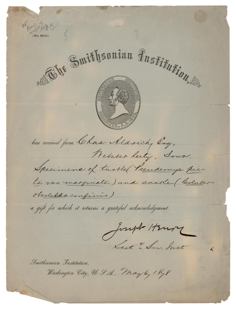 Physicist (1797-1878) who conducted experiments in the field of electromagnetism and served as the first secretary of the Smithsonian Institute. Partly-printed DS, one page, 8 x 10.75, May 6, 1878. Receipt from the Smithsonian Institution, in full: "The Smithsonian Institution has received from Chas. Aldrich?Specimens of turtle (Pseudenys picta var. marginata) and snake (Coluber obsoletus confinis), a gift for which it returns a grateful acknowledgment." In very good condition, with several small tears and losses to edges.