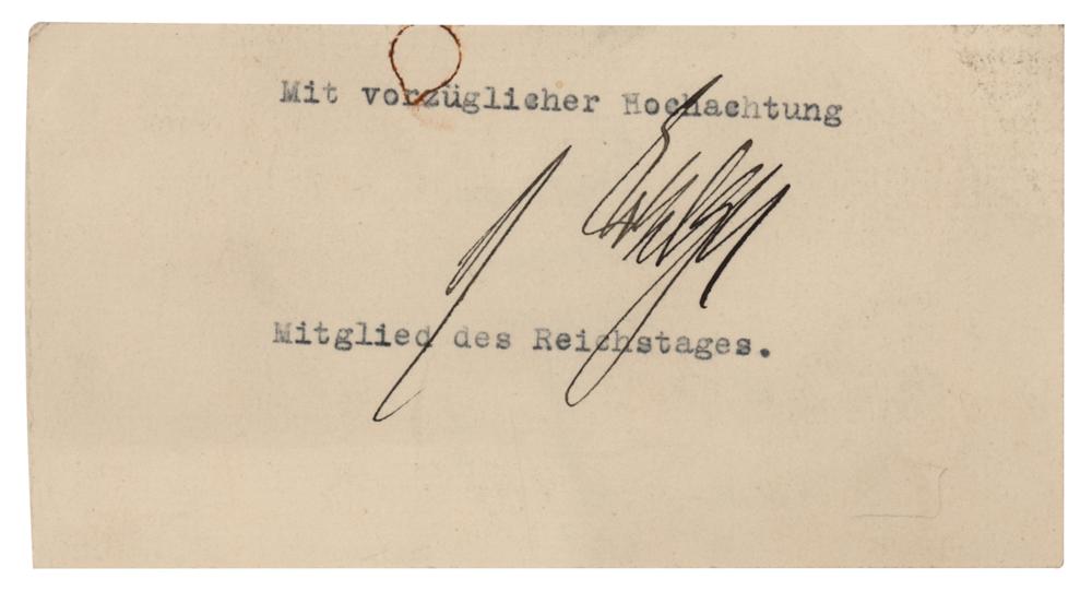 German publicist and politician (1875-1921) who spoke out against World War I and signed the armistice between Germany and the Allied Powers as head of the German delegation; he was assassinated in 1921 by the right-wing terrorist group Organisation Consul. Ink signature, "M. Erzberger," on an off-white 5 x 2.75 slip. In fine condition, with a rusty circular paperclip impression to the top.
