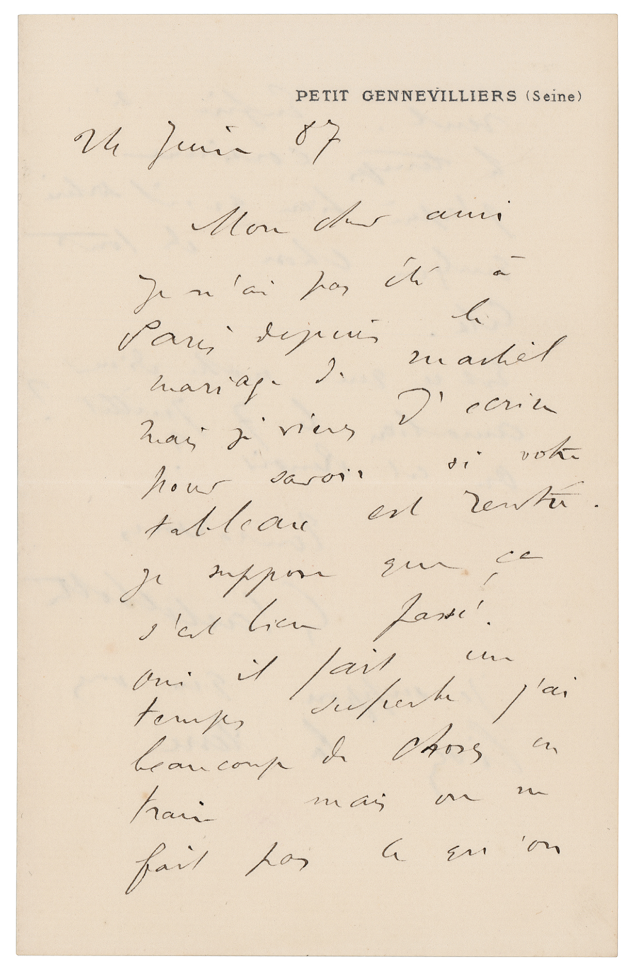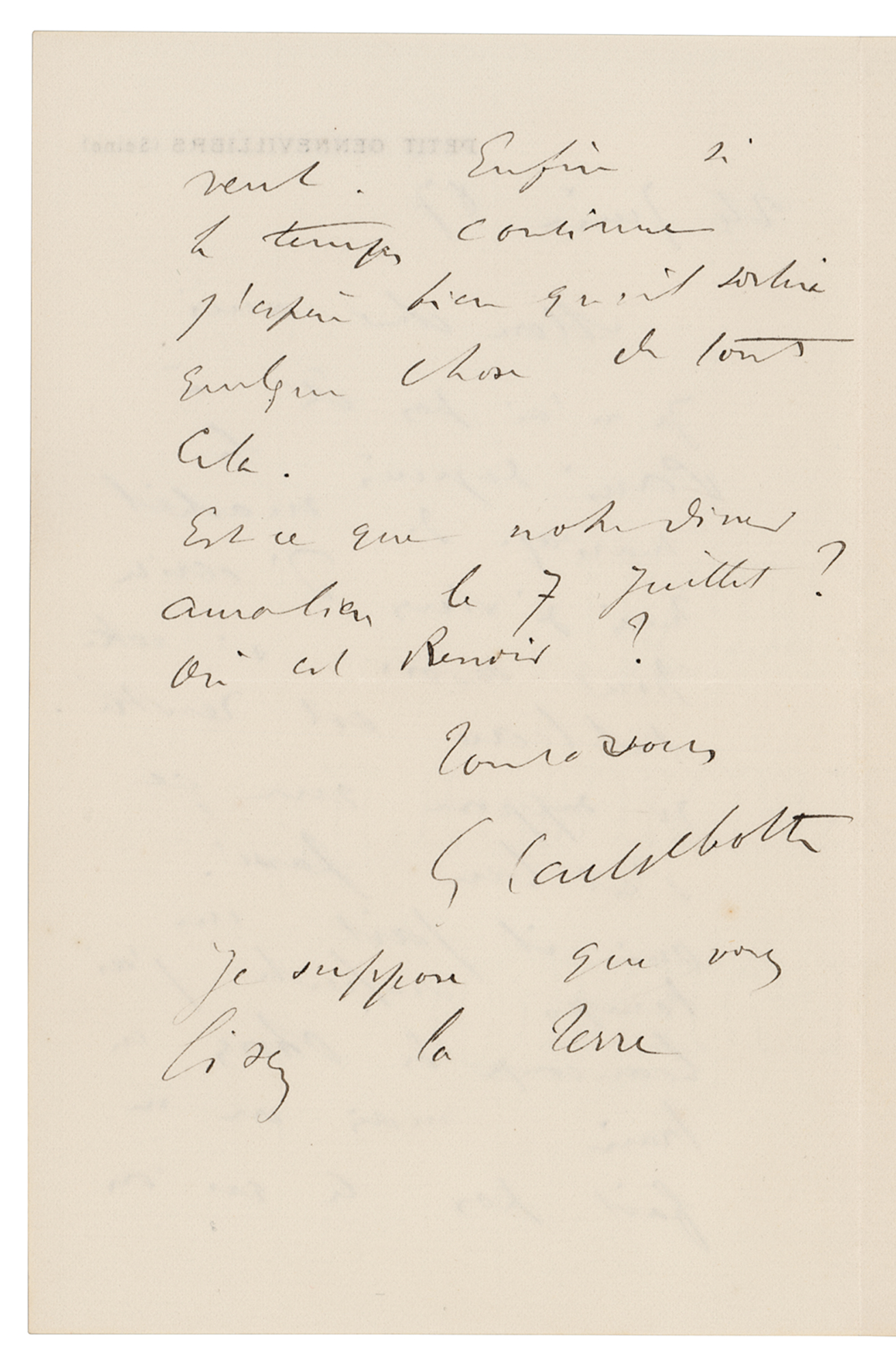 French painter (1848-1894) who was a member and patron of the Impressionists, although he painted in a more realistic manner than many others in the group. Caillebotte was noted for his early interest in photography as an art form. ALS in French, signed "G. Caillebotte," one page both sides, 4 x 6, Petit Gennevilliers (Seine) letterhead, June 24, 1887. Handwritten letter to his friend and fellow artist, the great impressionist painter Claude Monet, in full (translated): "I haven't been to Paris since the wedding of Martial but I have just written to know if your painting is back. I suppose that everything happened as it should. Yes, we have now superb weather and I have many things in the works but one cannot always do what he wants. Nevertheless if the weather continues I do hope that I will be able to produce something of everything that is in the works. Will our dinner still happen on July 7? Where is Renoir?" Caillebotte adds a short postscript: "I suppose you are reading La Terre." In fine condition. A fabulous letter that finds Caillebotte attempting to arrange a formidable artist dinner with the likes of Monet and Pierre-Auguste Renoir. Also of note is Caillebotte's mention of La Terre, an 1887 novel by influential French writer Emile Zola, who was famously painted by modernist painter and mutual acquaintance Edouard Manet.