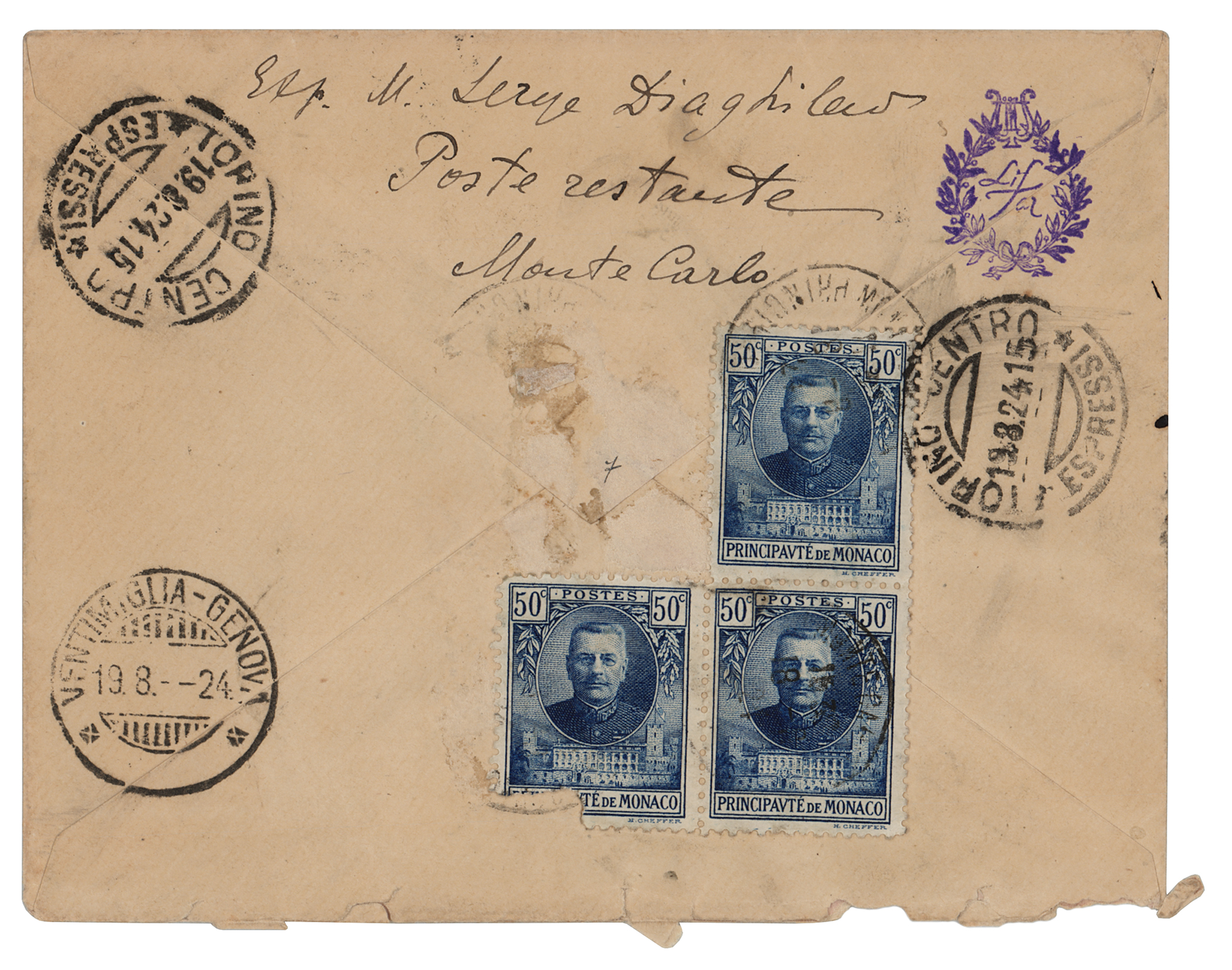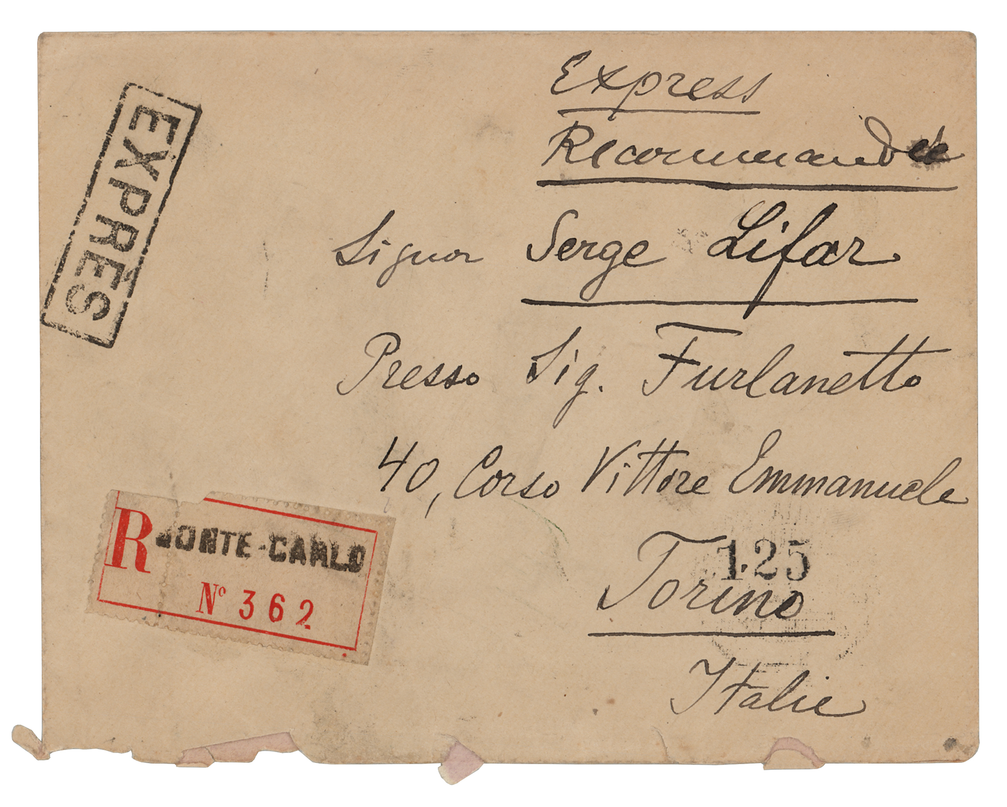 Russian art critic, patron, and ballet impresario (1872-1929) who was the founder of the Ballets Russes, from which many famous dancers and choreographers would arise. Mailing envelope, 5.75 x 4.25, postmarked August 19, 1924, addressed in the hand of Sergei Diaghilev to the famed Ukrainian ballet dancer and choreographer, "Signor Serge Lifar, Presso Sig. Furlanetto, 40, Corso Vittore Emmanuele, Torino, Italie," with Diaghilev adding his name to the reverse flap, "M. Serge Diaghilev, poste restante, Monte Carlo." In fine condition.