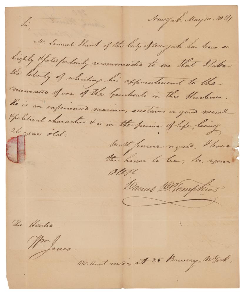 The sixth vice president of the United States under James Madison, who also served as the fourth governor of New York (1774-1825). ALS, one page, 8 x 9.75, May 10, 1814. Handwritten letter of recommendation to William Jones, in full: "Mr. Samuel Hunt of the City of New York has been so highly & satisfactorily recommended to one that I take the liberty of soliciting his appointment to the command of one of the Gunboats in this Harbour. He is an experienced mariner, sustains a good moral & political character & is in the prime of life, being 26 years old." In very good to fine condition, with light toning and a few small edge tears.