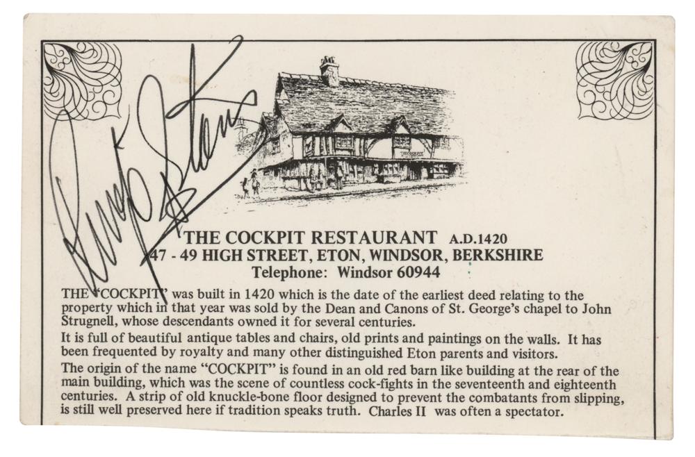 Glossy color 5.25 x 3.25 promotional card for the Cockpit Restaurant in Windsor, Berkshire, England, which has been signed on the reverse in black ink by Beatles drummer Ringo Starr. The consignor notes that the signature dates to the 1980s. In fine condition, with a trimmed top edge. Accompanied by a certificate of authenticity from Tracks.