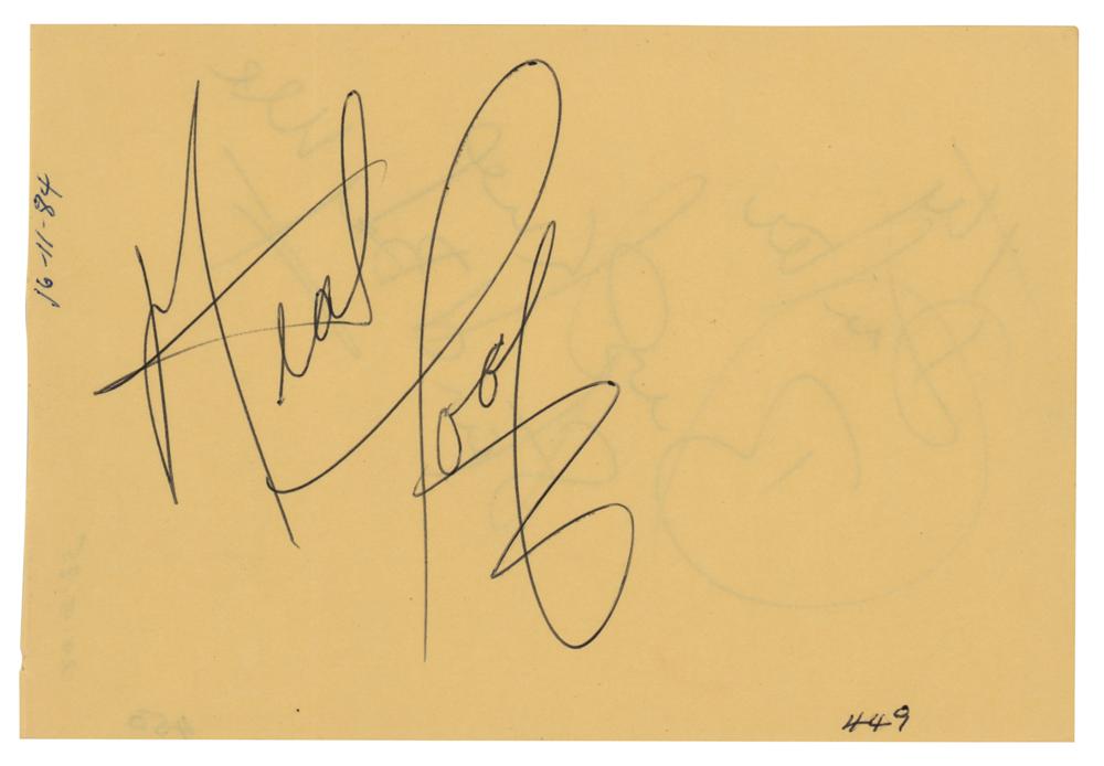 Ballpoint signature, "Meat Loaf," on a 5.75 x 3.75 album page. In fine condition, with light show-through from an unrelated signature on the back. The consignor notes that the autograph was obtained at Sheffield City Hall in Sheffield, Yorkshire, England on November 16, 1984. Accompanied by a certificate of authenticity from Tracks.