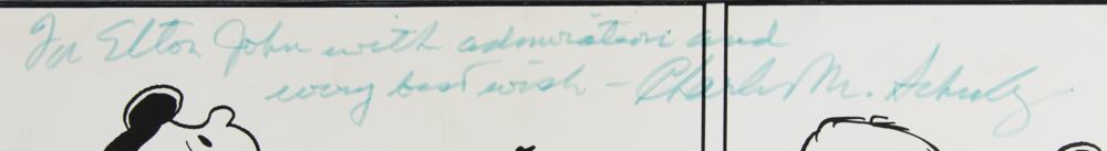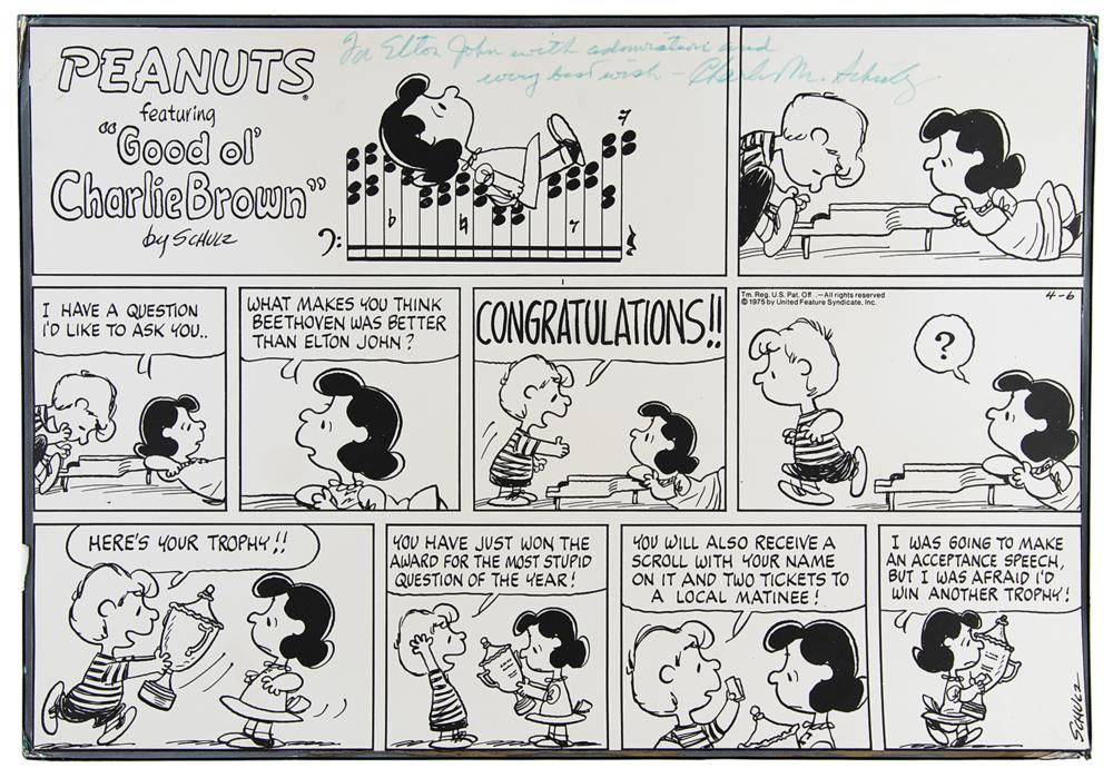Superb 22.5 x 15.25 reproduction print of a Peanuts daily comic strip from April 6, 1975, signed and inscribed in the upper section in blue felt tip, "For Elton John with admiration and every best wish-Charles M. Schulz." The 10-panel Elton John-themed comic strip features Schroeder and Lucy van Pelt, who asks the young piano player, "What makes you think Beethoven was better than Elton John?" Schroeder responds by congratulating Lucy, runs away and returns with a trophy, explaining "You have just won the award for the most stupid question of the year!" The last panel contains Schulz's preprinted artist signature. Affixed to a slightly larger mount and in fine condition, with the print beginning to peel from the mount. A desirable association piece between two artistic giants whose impact are still felt today.