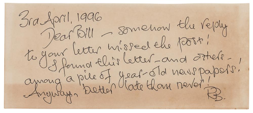 English thief (1929-2013) best remembered for his role in the Great Train Robbery of 1963, his escape from prison two years later, and his subsequent life as a fugitive for 36 years. ALS signed "RB," one page, 8.5 x 3.75, April 3, 1996. Handwritten letter to "Bill," in full: "Somehow the reply to your letter missed the post! I found this letter-and others-among a pile of year-old newspapers! Anyway, better late than never!" In fine condition, with irregular toning.