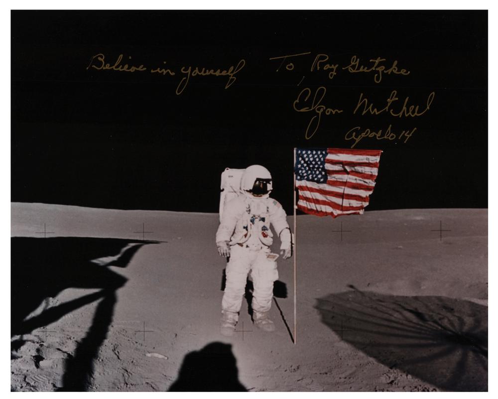 Color satin-finish 10 x 8 photo of Mitchell standing by the American flag on the lunar surface, signed and inscribed in gold ink, "Believe in yourself, To Roy Gutzke, Edgar Mitchell, Apollo 14." In very fine condition.