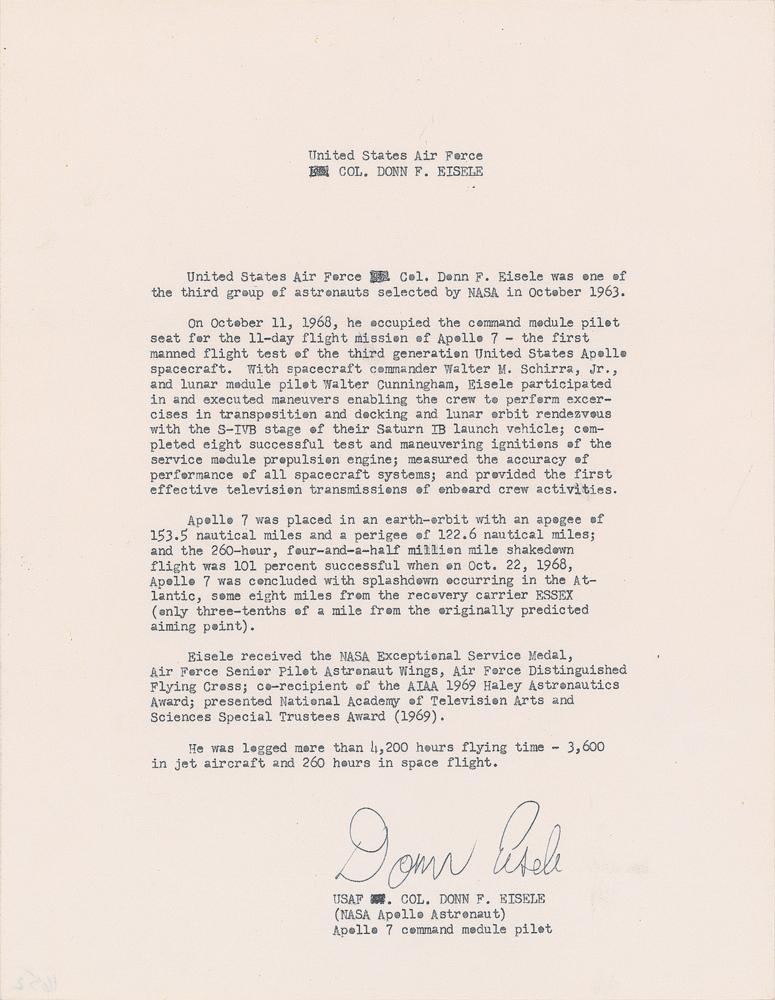 Typed biography of Apollo 7 astronaut Donn Eisele, one page, 8.5 x 11, signed at the conclusion in black ballpoint by Eisele. In part: "United States Air Force Col. Donn F. Eisele was one of the third group of astronauts selected by NASA in October 1963. On October 11, 1968, he occupied the command module pilot seat for the 1-day flight mission of Apollo 7-the first manned flight test of the third generation United States Apollo spacecraft. With spacecraft commander Walter M. Schirra, Jr., and lunar module pilot Walter Cunningham, Eisele participated in and executed maneuvers enabling the crew to perform exercises in transposition and decking and lunar orbit rendezvous with the S-IVB stage of their Saturn IB launch vehicle; completed eight successful test and maneuvering ignitions of the service module propulsion engine; measured the accuracy of performance of all spacecraft systems; and provided the first effective television transmissions of onboard crew activities?Eisele received the NASA Exceptional Service Medal, Air Force Senior Pilot Astronaut Wings, Air Force Distinguished Flying Cross; co-recipient of the AIAA 1969 Haley Astronautics Award; presented National Academy of Television Arts and Sciences Special Trustees Award (1969)." In fine condition.