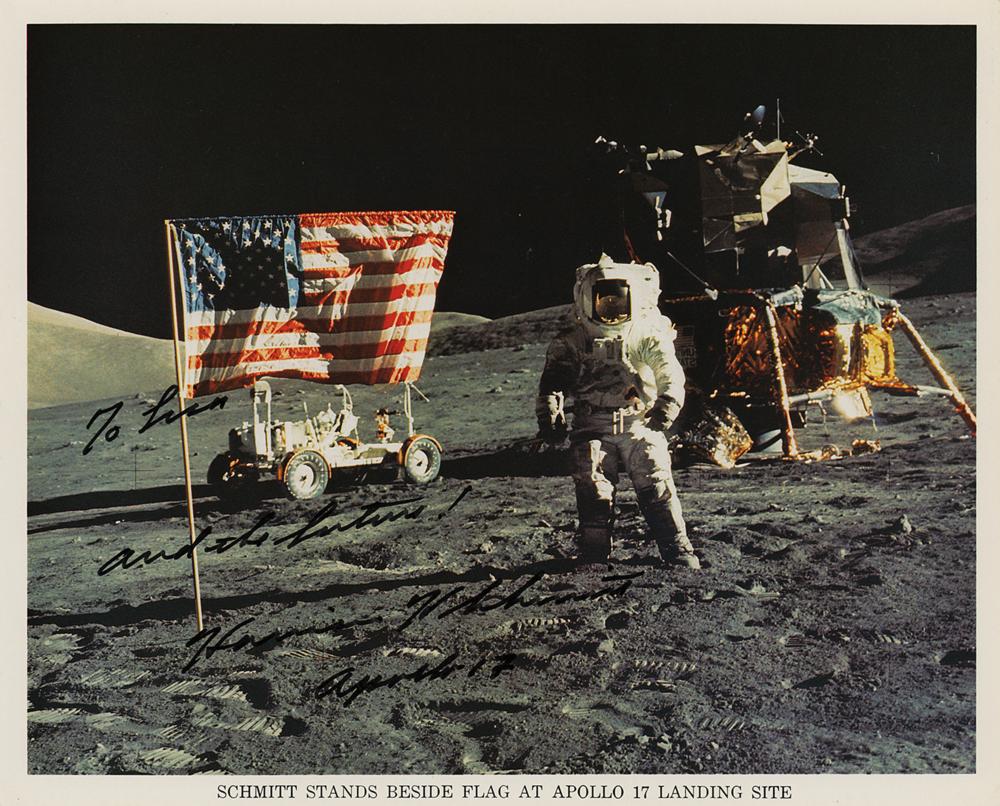 Official color 10 x 8 NASA lithograph of LMP Schmitt posing beside the American flag at the Apollo 17 lunar landing site, signed and inscribed in black felt tip, "To Lisa, and the future! Harrison H. Schmitt, Apollo 17." In very fine condition.