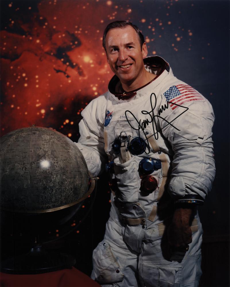 Color satin-finish 8 x 10 photo of Jim Lovell posing in his white space suit with a lunar globe, signed in black felt tip. In very fine condition.