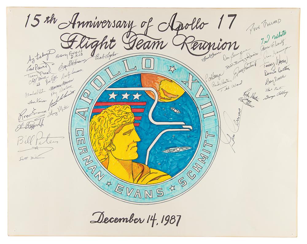 One-of-a-kind handmade color poster for the "15th Anniversary of Apollo 17 Flight Team Reunion," 28.25 x 22.25, dated December 14, 1987, featuring a large central design of the Apollo 17 mission insignia accomplished in colored felt tip, signed by the prime crew of Gene Cernan, Harrison "Jack" Schmitt, and Ron Evans, as well as by 36 members of the mission control flight support team, including: Gene Kranz, Sy Liebergott, Tex Ward, Dave Ballard, Ted White, Terry Watson, Fred Frere, Bill Peters, Bob Legler, Terry Neal, George Abbey, and more. In fine condition, with some light creasing, and tack holes to the corners. A desirable in-house celebration poster that boasts a large portion of Apollo 17 flight team staffers, with extra attention being paid to the presence of Abbey, a former director of the Johnson Space Center, whose autograph remains quite rare.