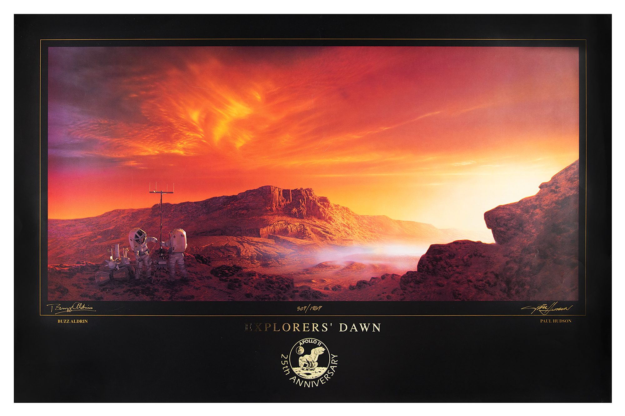Limited edition color 34 x 22 print entitled 'Explorer's Dawn,' honoring the 25th anniversary of the Apollo 11 lunar landing, numbered 309/1969, signed in gold ink by Buzz Aldrin and artist Paul Hudson. In fine condition, with some small creases, light edgewear, and a tiny fleck of surface loss to the bottom edge.