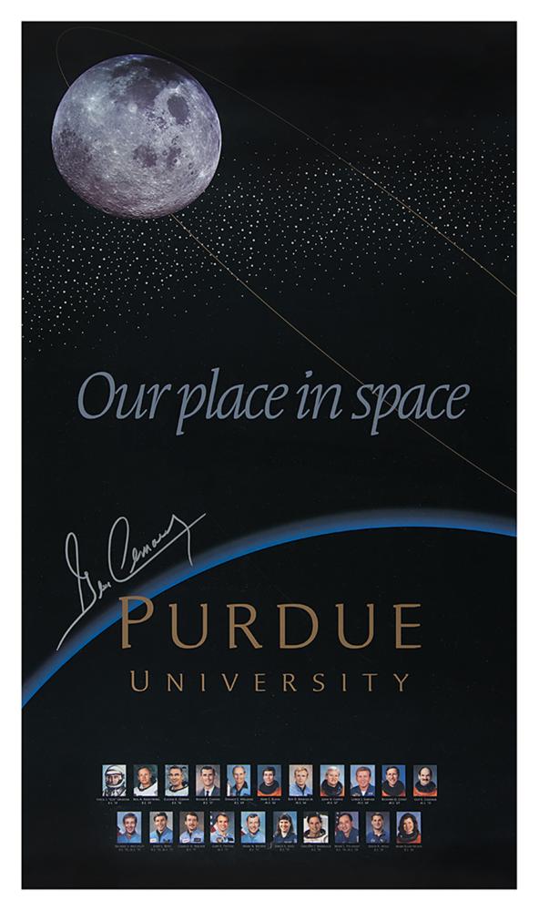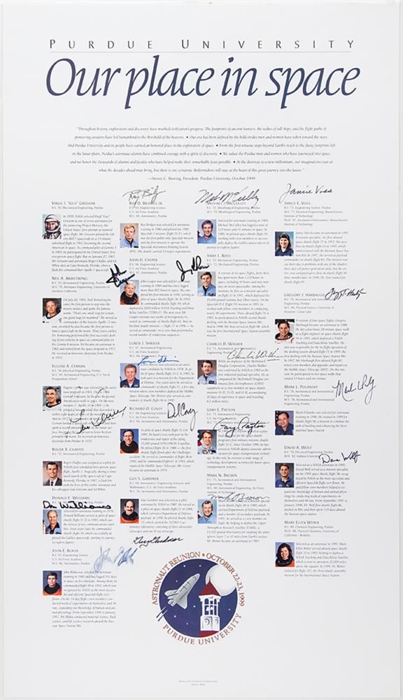 Laminated dual-sided color 16 x 28 poster commemorating the Purdue University 1999 Astronaut Reunion, signed on the reverse in felt tip by 17 space-exploring Boilermaker alumni, including: Gene Cernan (who also signs prominently on the attractive front side), Don Williams, John Blaha, Roy Bridges, John Casper, Loren Shriver, Dick Covey, Guy Gardner, Mike McCulley, Jerry Ross, Charles Walker, Gary Payton, Mark Brown, Janice Voss, Greg Harbaugh, Mark Polansky, and Dave Wolf. Rolled and in fine condition, with a smudge to Blaha's signature.