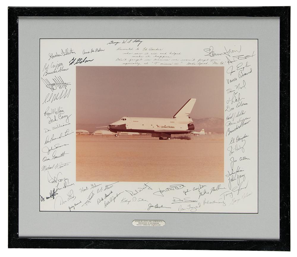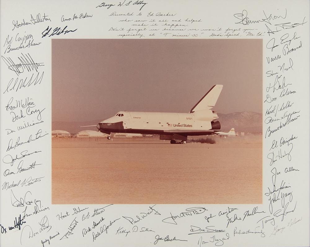 Color glossy 13.25 x 10.25 photo of the Space Shuttle Enterprises, affixed to its original 19.5 x 15.5 mount, inscribed at the top of the mount in an unknown hand to NASA Command Controller Ed Barker, "Presented to Ed Barker, who saw it all and helped make it happen. Don't forget us because we won't forget you-especially at 'T minus 30,' God's Speed, 'Mr. Ed,'" and signed on the mount by 50 astronauts representing the Apollo, Skylab, and Space Shuttle programs, including: John Young, Alan Bean, Ellison Onizuka, Dick Scobee, Judy Resnik, Ron McNair, Bob Crippen, Ed Gibson, Gordon Fullerton, Owen Garriott, Jack Lousma, Joe Engle, Vance Brand, Steve Nagel, Don Peterson, Steven Hawley, Karol J. Bobko, Rhea Seddon, Brewster Shaw, Joe Allen, John M. Fabian, Tony England, George Nelson, Richard Truly, Mike Mullane, John Creighton, Norm Thagard, Paul Weitz, Kathryn Sullivan, Dale Gardner, Rick Hauck, Bob Stewart, Hoot Gibson, Don Lind, James van Hoften, Loren Shriver, Fred Gregory, Michael Coats, Dan Brandenstein, Dick Covey, Jeff Hoffman, and administrator George Abbey. Matted and framed to an overall size of 25.5 x 22. In very fine condition. A highly desirable group of signatures, highlighted by moonwalkers Young and Bean, and four of the heroic astronauts lost in the Challenger disaster-Scobee, Onizuka, Resnik, and McNair.