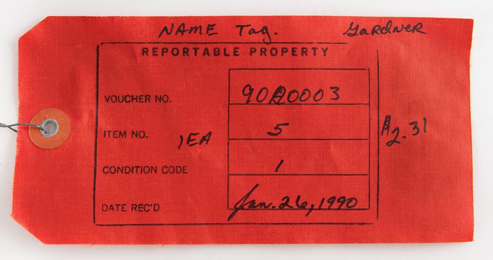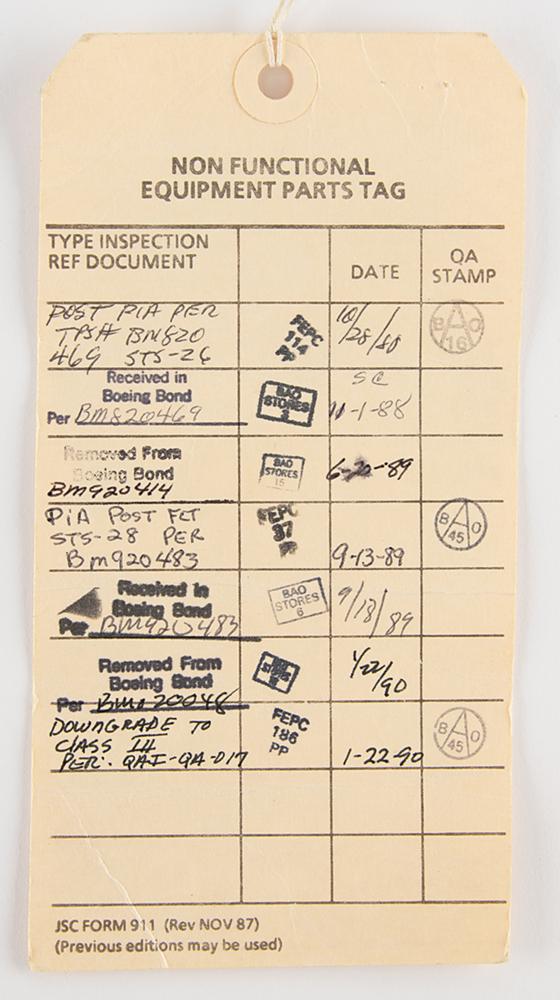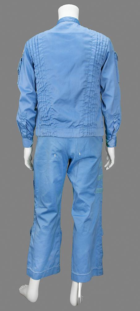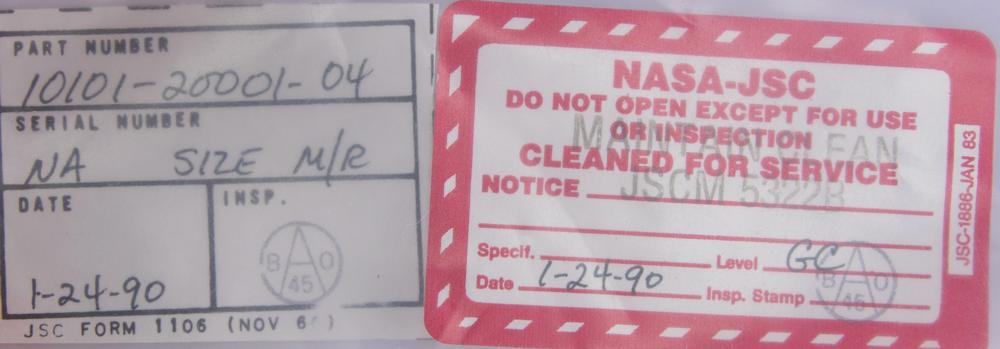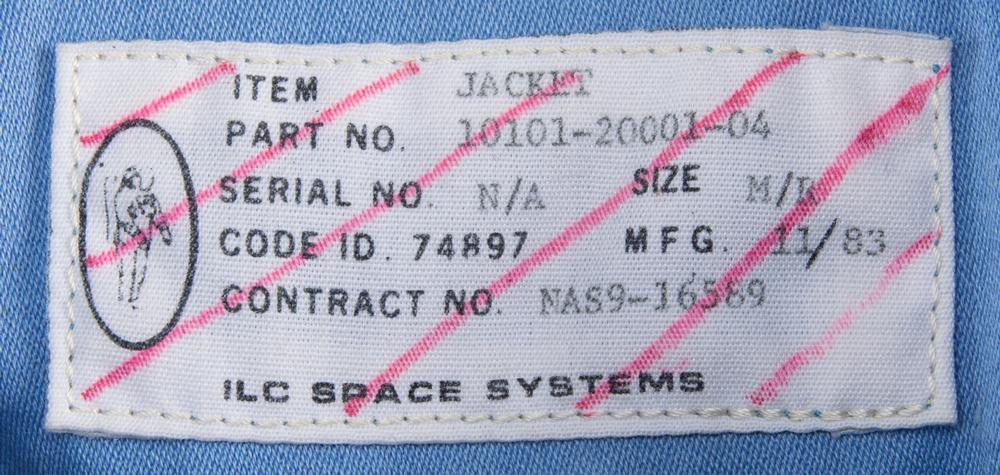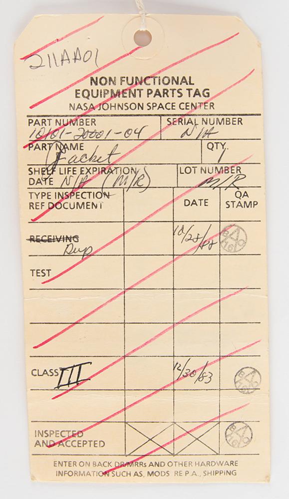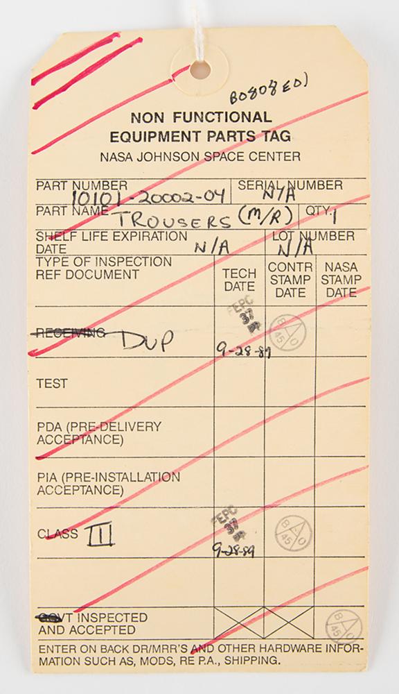 The matching trousers have the original ILC Space Systems tag inside the fly, which is faded but has most numbers recorded on the accompanying non-functional equipment parts tag: "Item: Trousers, Part No. 10101-20002-04, Serial No. N/A, Size M/R." Like the tag in the jacket, it was evidently struck through with red ink when the trousers were downgraded to a Class III non-flight item in 1990. Also includes its original bag with NASA-JSC cleaning label.