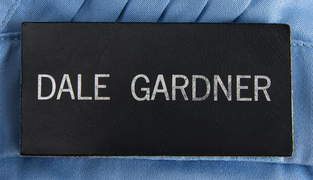 Dale Gardner's flown blue flight suit worn aboard the Space Shuttle Discovery on the STS-51-A mission, comprising his jacket and pants. The zip-up jacket features embroidered NASA 'meatball' and 'worm' logo patches on the chest, as well as a large STS-51-A mission patch and "Dale Gardner" name patch attached with Velcro. The left shoulder features an embroidered patch of the flag of the United States. The original ILC Space Systems tag is sewn inside the collar, reading: "Item: Jacket, Part No. 10101-20001-04, Serial No. N/A, Size M/R, Code ID 74897, Mfg. 11/83, Contract No. NAS9-16589." The tag was evidently struck through with red ink when the jacket was downgraded to a Class III non-flight item in 1990, as indicated by the accompanying non-functional equipment parts inspection tag. Includes its original bag with NASA-JSC cleaning label and attached red NASA property tags for the jacket and name tag.