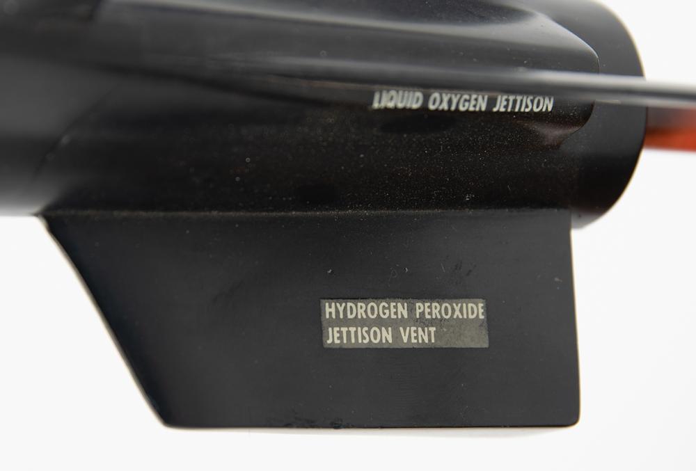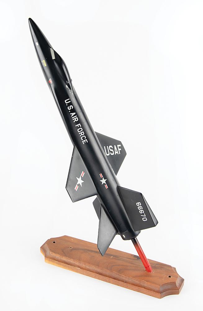 Appealing 1:40 scale plastic model of a North American X-15 rocket plane, measuring approximately 14.5" long with a wingspan of 6.75", featuring "U.S. Air Force" markings with a tail number of "66670." Includes a wooden stand. In fine condition, with some light wear.
