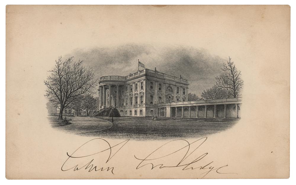 Attractive engraving of the south portico of the White House, 6.5 x 5, signed in ink by Calvin Coolidge as president. In fine condition, with some light toning and soiling. Accompanied by the original White House mailing envelope postmarked March 17, 1925.