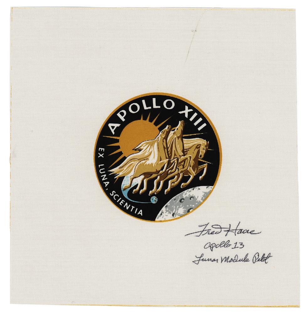 Appealing 8 x 8 swatch of Beta cloth bearing a central design of the Apollo 13 mission insignia, nicely signed in black ballpoint, "Fred Haise, Apollo 13, Lunar Module Pilot." In very fine condition.