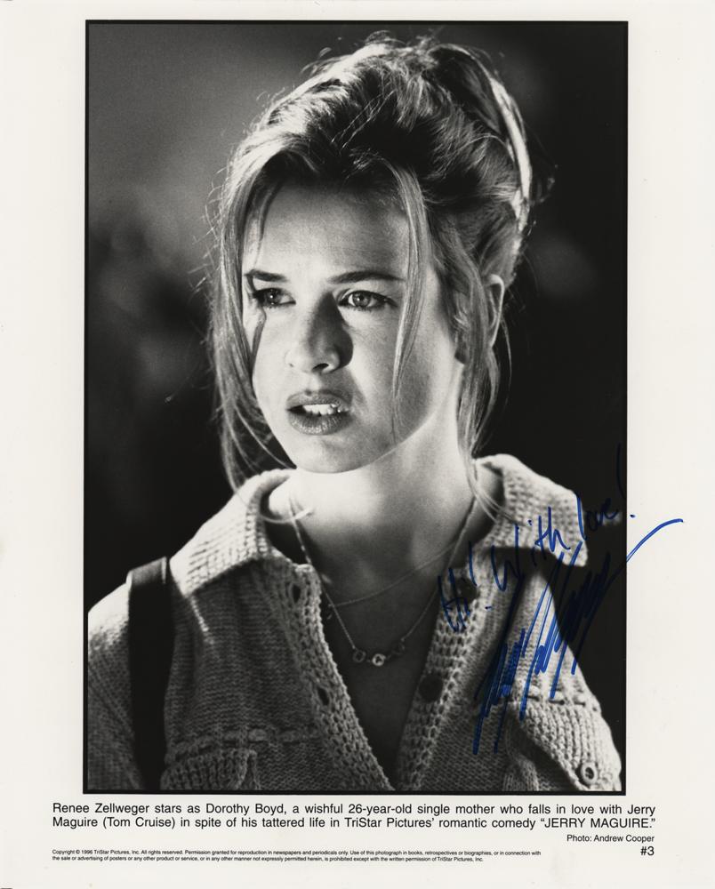 Satin-finish 8 x 10 photo of Zellwegger as Dorothy Boyd in the 1996 film Jerry Maguire, signed in blue felt tip, "Hi! With love! Renee Zellwegger." In fine condition.