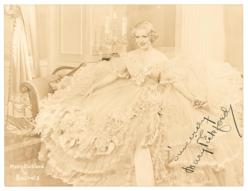 Vintage matte-finish 8.5 x 6.5 photo of Pickford in a huge ball gown in the 1933 film Secrets, boldly signed in fountain pen, "Sincerely, Mary Pickford." In fine condition, with a hint of light silvering.