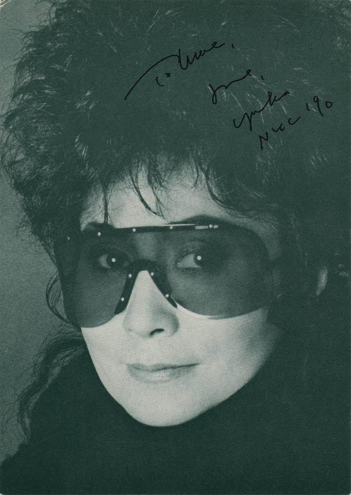 Cardstock 4.25 x 6 close-up photo of Yoko Ono in a pair of sunglasses, signed and inscribed in black felt tip, "To Mae, love, Yoko, NYC '90." In fine condition.