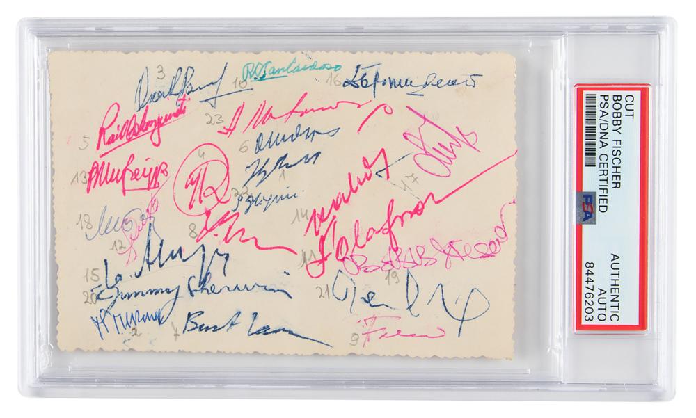 Vintage red ballpoint signature, "Bobby Fischer," on the reverse of a 5 x 3.25 postcard depicting the 21 competitors of the 1958 Portoroz Interzonal Chess Tournament, all of whom have joined Fischer in adding their autographs, including: Yuri Averbakh, Pal Benko, David Bronstein, Rodolfo Cardoso, Boris de Greiff, Miroslav Filip, Géza Füster, Svetozar Gligorić, Bent Larsen, Aleksandar Matanović, Oleg Neikirch, Friðrik Ólafsson, Ludek Pachman, Oscar Panno, Tigran Petrosian, Héctor Rossetto, Raúl Sanguineti, James Sherwin, László Szabó, and Mikhail Tal. The postcard is also signed by chess arbiters Harry Golombek and Vladimir Vuković. In fine condition. Encapsulated in a PSA/DNA authentication holder.