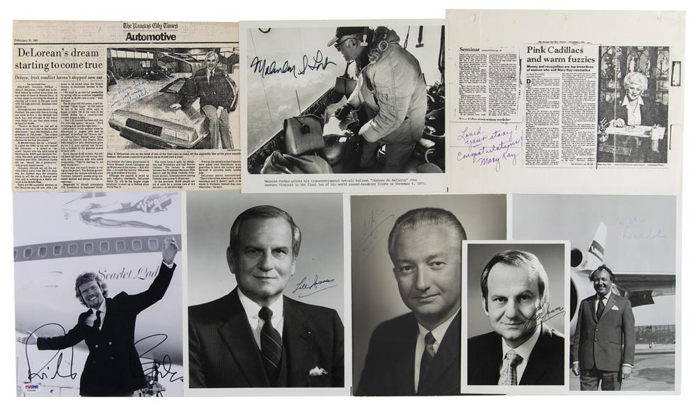 Eight items signed by noteworthy businesspeople, mostly consisting of photos. Includes: automotive engineer John DeLorean (newspaper article), airline entrepreneur Freddie Laker (SP), automobile executive Lee Iacocca (two SPs), cosmetics mogul Mary Kay (newspaper article), famed entrepreneur Malcolm Forbes (SP), takeover artist Meshulam Riklis (SP), and business magnate Richard Branson (SP). In overall fine condition.