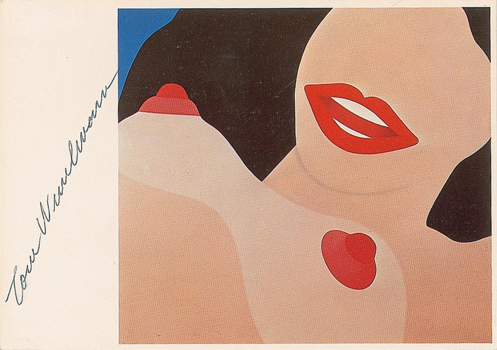 American artist (1931-2004) associated with the Pop Art movement who worked in painting, collage, and sculpture. Vibrant color postcard of Wesselmann's work entitled 'Great American Nude 76,' signed in the border in black ballpoint. In fine condition.