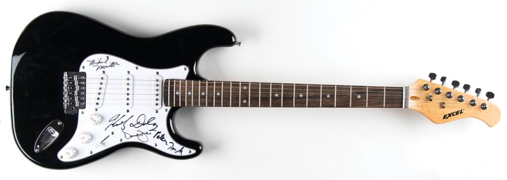 Black-bodied Excel Stratocaster-style electric guitar signed on the white pickguard in black felt tip by David Jones, Mickey Dolenz, Peter Tork, and Michael Nesmith. In fine condition. Accompanied by a carrying bag and a full letter of authenticity from JSA.