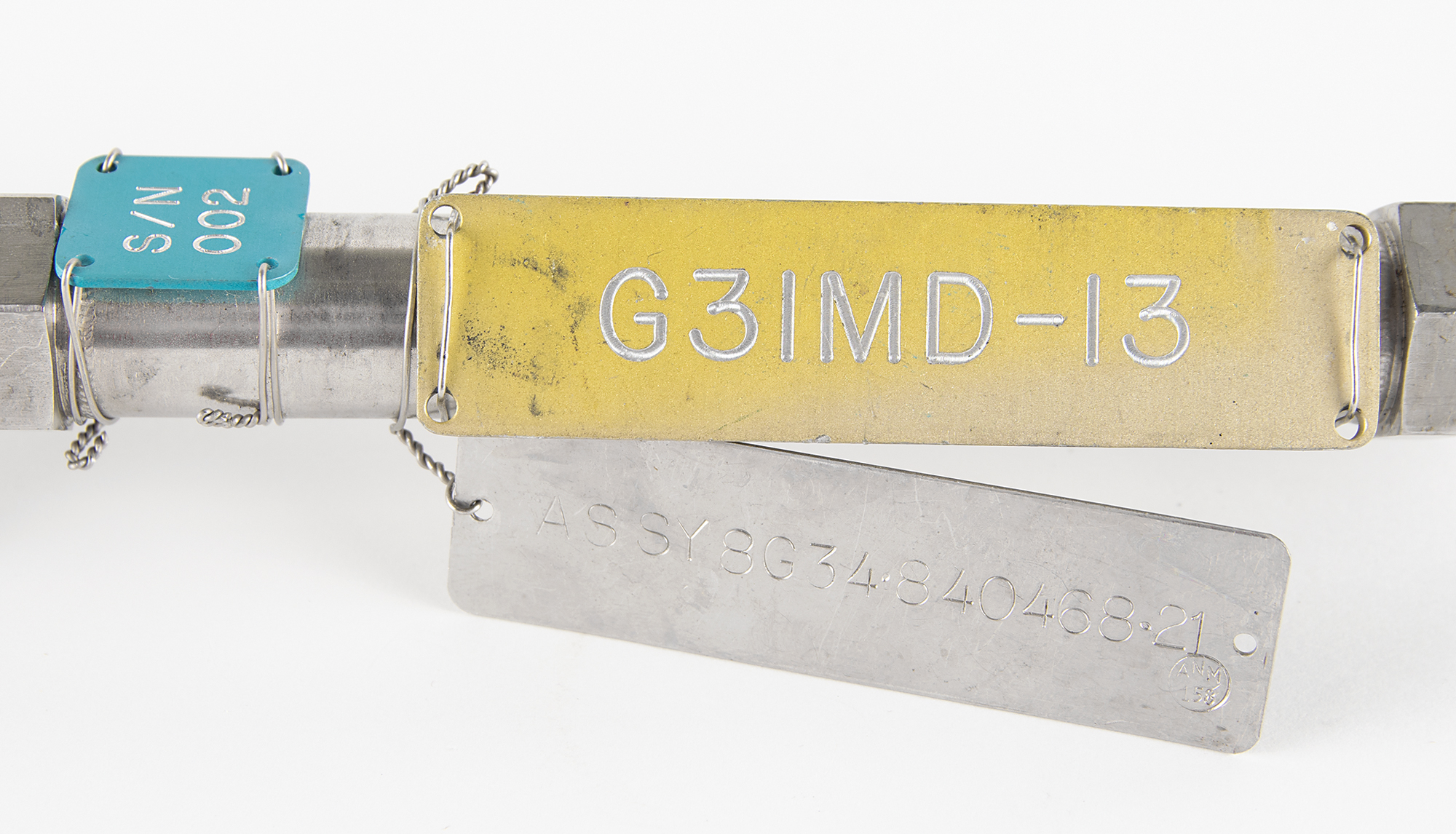Apollo-era Aerozine 50 (N2H4/UDMH) fill valve assembly, measuring approximately 12.25" long and 2" in diameter, marked on the cover, "Coupling-Class 2, Type I, N2H4/UDMH Fill Vent Disconnect, NAA/S & ID Cont No. ME273-0024-0002." The attached filter tube assembly is marked on the side: "Filter Assy., 15 Micron Absolute?S/N 410, P/N 15241-606, Date of Mfg. 9-1-71." Additional metal tags are attached at center. This fill valve assembly is designed to make a safe connection between the source of the fuel and the tank to be filled: the valve cannot be opened until the connecting end is fully seated against the receiving receptacle.