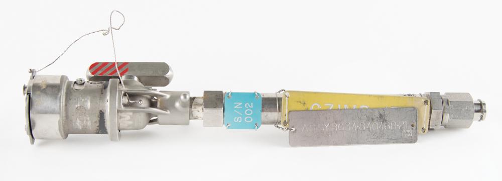 Apollo-era Aerozine 50 (N2H4/UDMH) fill valve assembly, measuring approximately 12.25" long and 2" in diameter, marked on the cover, "Coupling-Class 2, Type I, N2H4/UDMH Fill Vent Disconnect, NAA/S & ID Cont No. ME273-0024-0002." The attached filter tube assembly is marked on the side: "Filter Assy., 15 Micron Absolute?S/N 410, P/N 15241-606, Date of Mfg. 9-1-71." Additional metal tags are attached at center. This fill valve assembly is designed to make a safe connection between the source of the fuel and the tank to be filled: the valve cannot be opened until the connecting end is fully seated against the receiving receptacle.