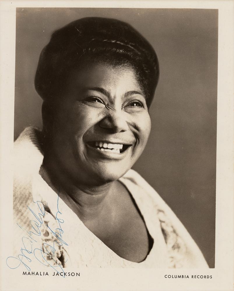 Vintage glossy 8 x 10 Columbia Records publicity photo of Mahalia Jackson smiling, signed in blue ballpoint. In fine condition, with minor skipping to ink and a few minor scratches to emulsion.