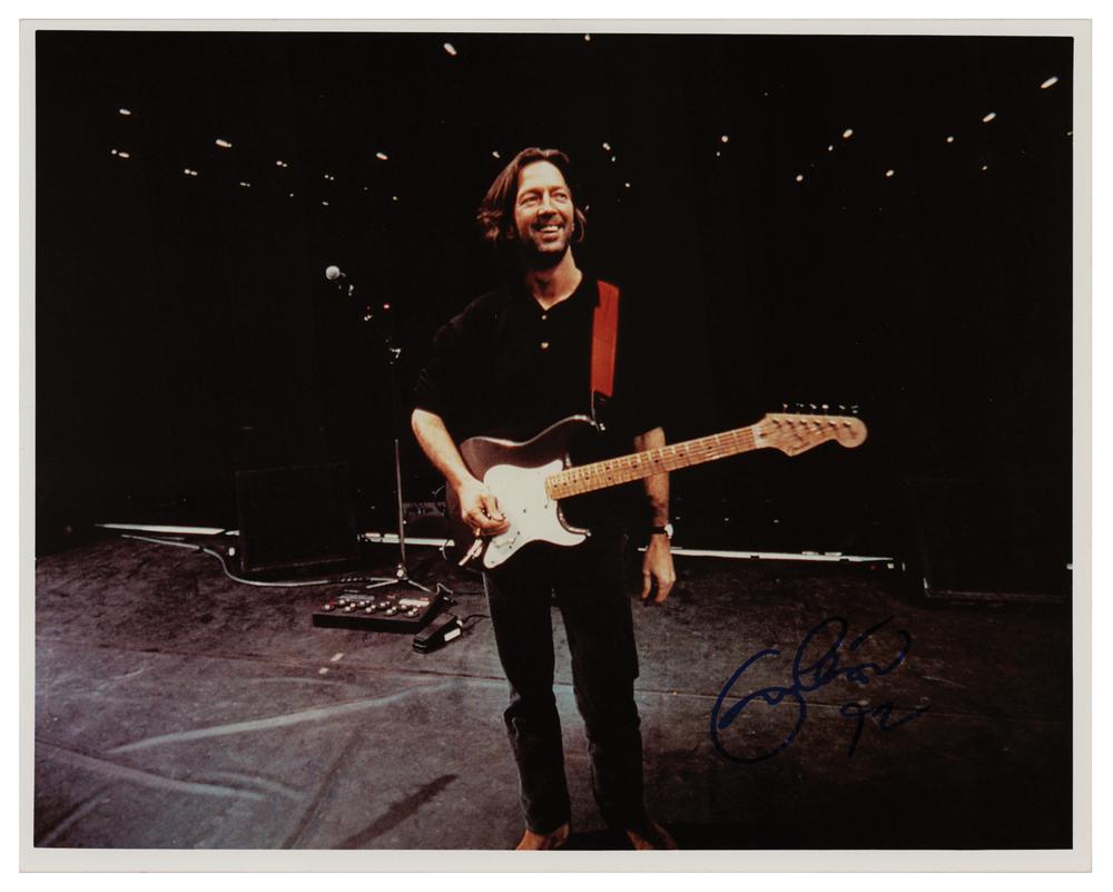 Color glossy 10 x 8 photo of Eric Clapton standing on stage with 'Blackie,' his favorite Fender Stratocaster guitar, signed in blue felt tip, with Clapton adding "92." In very fine condition.
