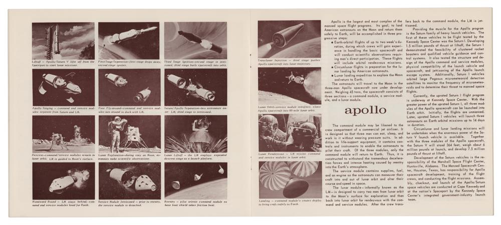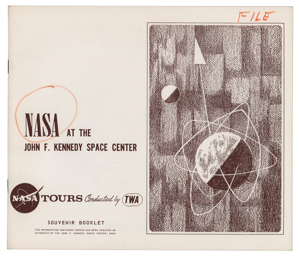 Souvenir booklet entitled "NASA at the John F. Kennedy Space Center," prepared for "NASA Tours Conducted by TWA," 24 pages, 9.25 x 8, providing brief outlines of NASA's launch vehicles, manned space flight programs (Mercury, Gemini, and Apollo), and a description of Launch Complex 39, and a few other related topics. In fine condition, with a "File" notation and red felt tip circle drawn on the front cover.