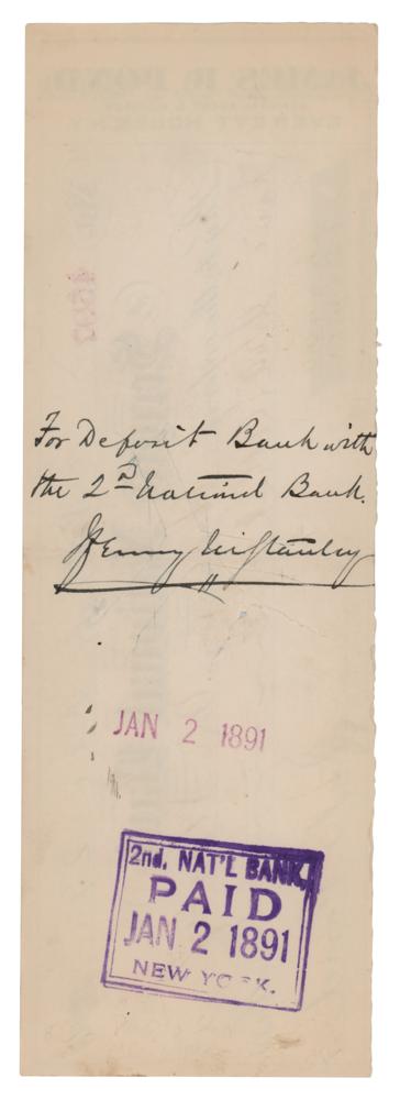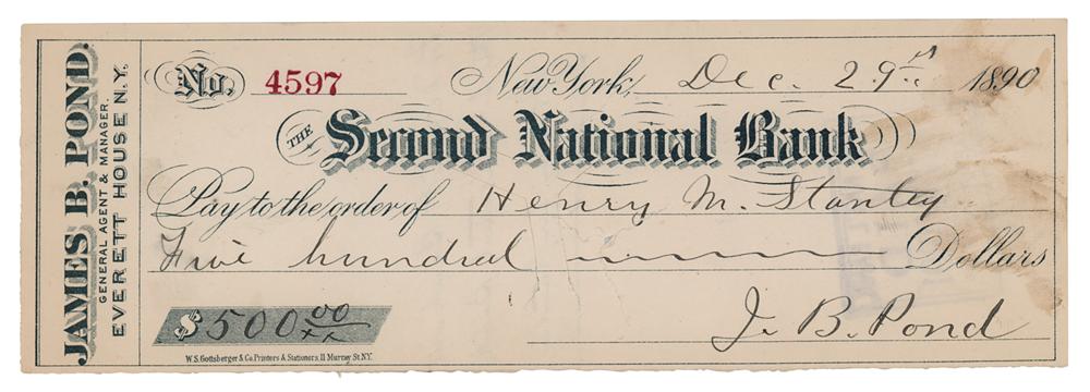 Personal bank check belonging to noted lecture promoter James B. Pond, 8.25 x 2.75, filled out and signed by Pond, payable to Henry M. Stanley for $500, December 29, 1890. Endorsed on the reverse in fountain pen, "For Deposit Bank with the 2nd National Bank, Henry M. Stanley." In fine condition.