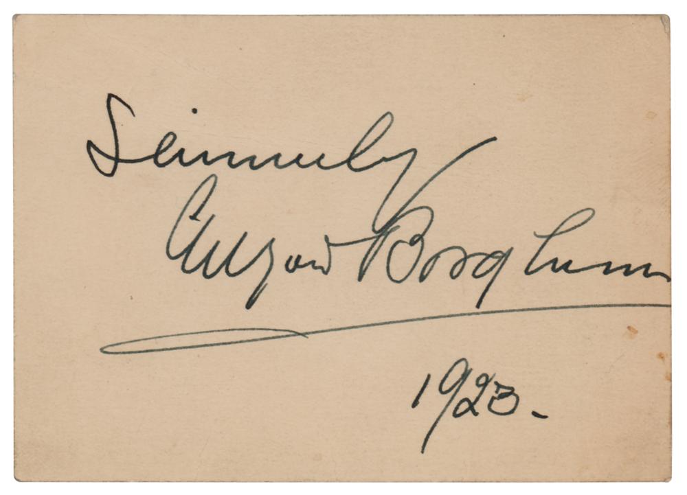 Fountain pen signature, "Sincerely, Gutzon Borglum, 1923,” on an off-white 3.75 x 2.5 card. In fine condition. Accompanied by a vintage postcard photo of Borglum on a sculpting swing.