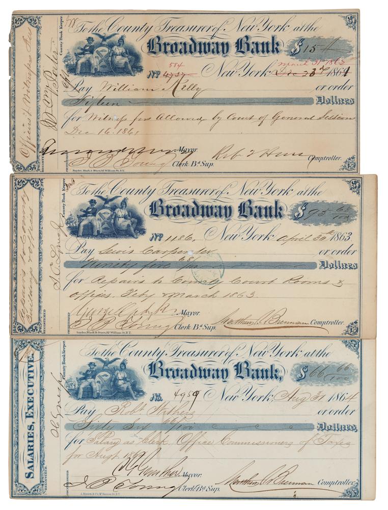Three Civil War-dated checks issued to The County Treasurer of New York at the Broadway Bank, each 8.25 x 3.75, dating to 1862, 1863, and 1864, individually signed by former New York Mayors Charles G. Gunther, George Opdyke, and Fernando Wood. In overall fine condition.