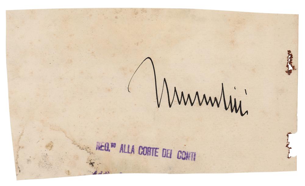 Bold ink signature, "Mussolini," on an off-white 6 x 3.5 slip cut from a larger document. In very good to fine condition, with staining to the lower left corner, and ink erosion to the right edge, all of which could easily be matted out.