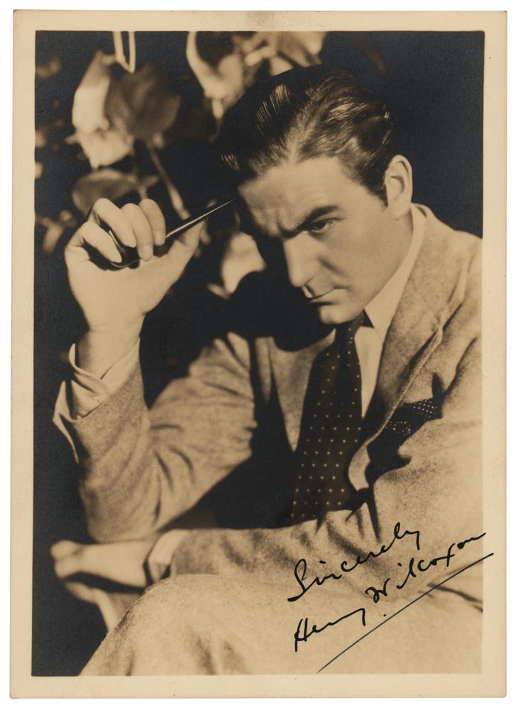 Actor (1905-1984) celebrated as a leading man in many of Cecil B. DeMille's films, but perhaps best known to modern audiences as the golfer-turned-atheist Bishop Pickering in the 1980 comedy classic Caddyshack. Vintage matte-finish 5 x 7 photo of Wilcoxon in a pensive pose, boldly signed in fountain pen, "Sincerely, Henry Wilcoxon." In fine condition, with silvering to dark areas of the image.