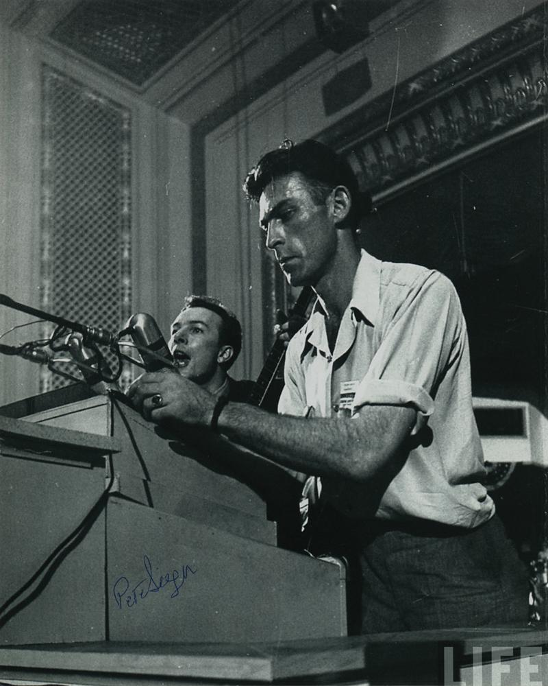Satin-finish 8 x 10 photo of Pete Seeger at a podium, signed in blue ballpoint. In fine condition.