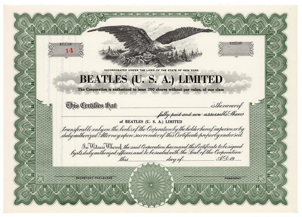 Blank original stock certificate for "Beatles (U.S.A.) Limited," one page, 11 x 7.75, no date but circa 1964, marked as "Number 14." Established in 1964 to oversee the Beatles' business affairs in America, the original board of directors was comprised of Brian Epstein, Walter Hofer, and Sandra Hofer. The consignor notes that only 20 of these numbered certificates exist. In very fine condition.