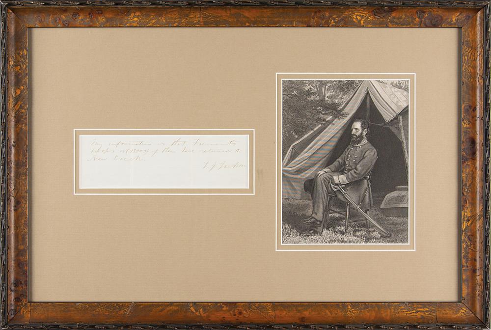 Civil War-era ANS signed “T. J. Jackson,” one page, 7.25 x 2.25, no date (circa May / June 1862). Brief handwritten note to an unidentified recipient: "My information is that Fremonts troops or (15000) of them have returned to New Creek." Handsomely double-matted and framed with an engraved portrait to an overall size of 21 x 14.25. In fine condition. The consignor notes that another hand has on the reverse written: "This was given me by Col. A. W. Harman—Adjt. Gen. on 'Stonewall Jackson's' Staff & the attached P.S. was to him personally, Staunton, Va., Sepr. 1882."