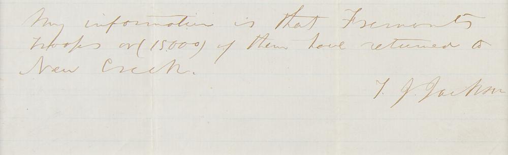 This important Civil War-era message dates to the Southern general's famed campaign through the Shenandoah Valley in Virginia. Jackson's 17,000 men marched 646 miles in 48 days, successfully engaged three Union armies and prevented them from reinforcing the Union offensive against Richmond. The victory bolstered the morale of Confederate troops, which had started to waver at that time. Acting upon the intelligence identified here, Jackson prepared to confront Union Major General John C. Fremont, who had been ordered by President Abraham Lincoln to 'capture or destroy' Jackson's forces. The mention of "New Creek" may be a reference to Mill Creek and the Battle of Cross Keys in June. Fremont had pursued Jackson for eight days, finally confronting him at this battle—only to have Jackson slip away.