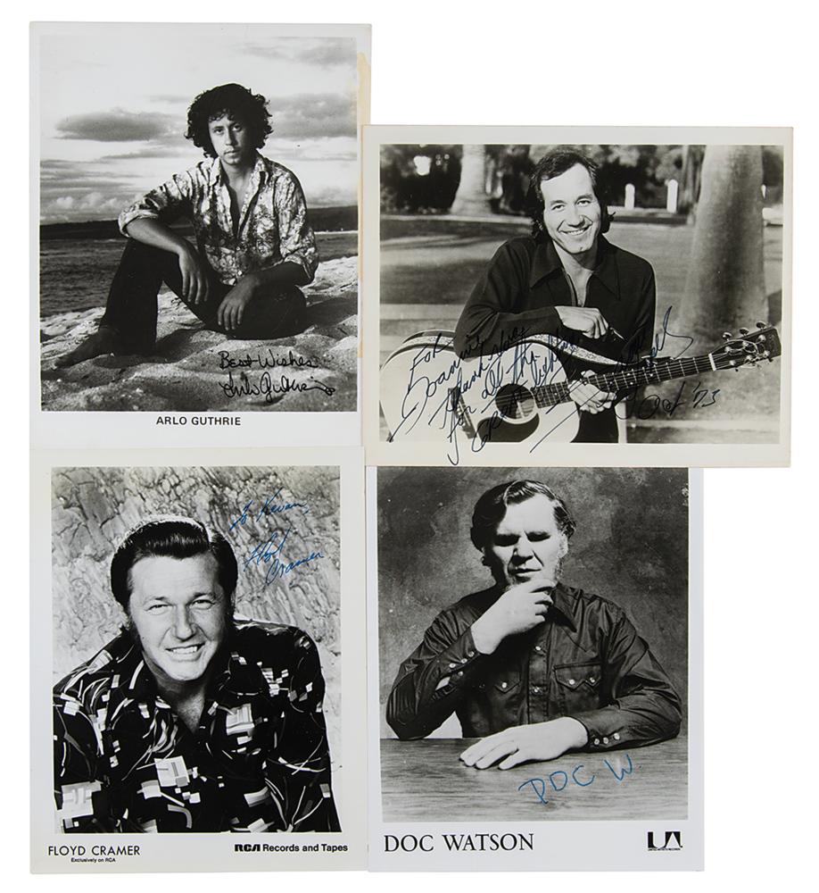 Four glossy photos of noteworthy country and folk artists, 8 x 10 and 10 x 8, each signed in felt tip by the subject. Includes: Doc Watson, Trini Lopez (ins), Arlo Guthrie, and Floyd Cramer (ins). In overall very good to fine condition, with staining to one edge of the Guthrie photo.