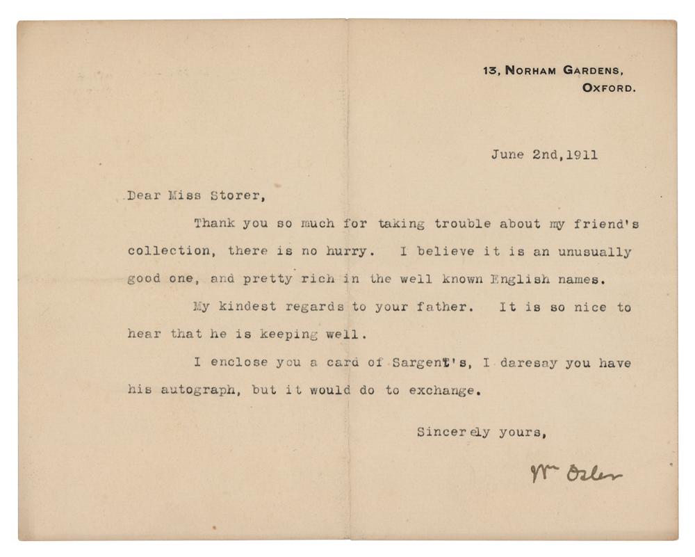 Canadian-born physician and researcher (1849-1919) who was a founding professor of Johns Hopkins Hospital, widely regarded as the 'Father of Modern Medicine' for his pioneering work in medical assessment, diagnosis, and education. TLS signed “Wm. Osler,” one page, 8 x 6.25, 13 Norham Gardens, Oxford letterhead, June 2, 1911. Letter to Miss Storer, in full: "Thank you so much for taking trouble about my friend's collection, there is no hurry. I believe it is an unusually good one, and pretty rich in the well known English names. My kindest regards to your father. It is so nice to hear that he is keeping well. I enclose you a card of Sargent's, I daresay you have his autograph, but it would do to exchange." In fine condition.